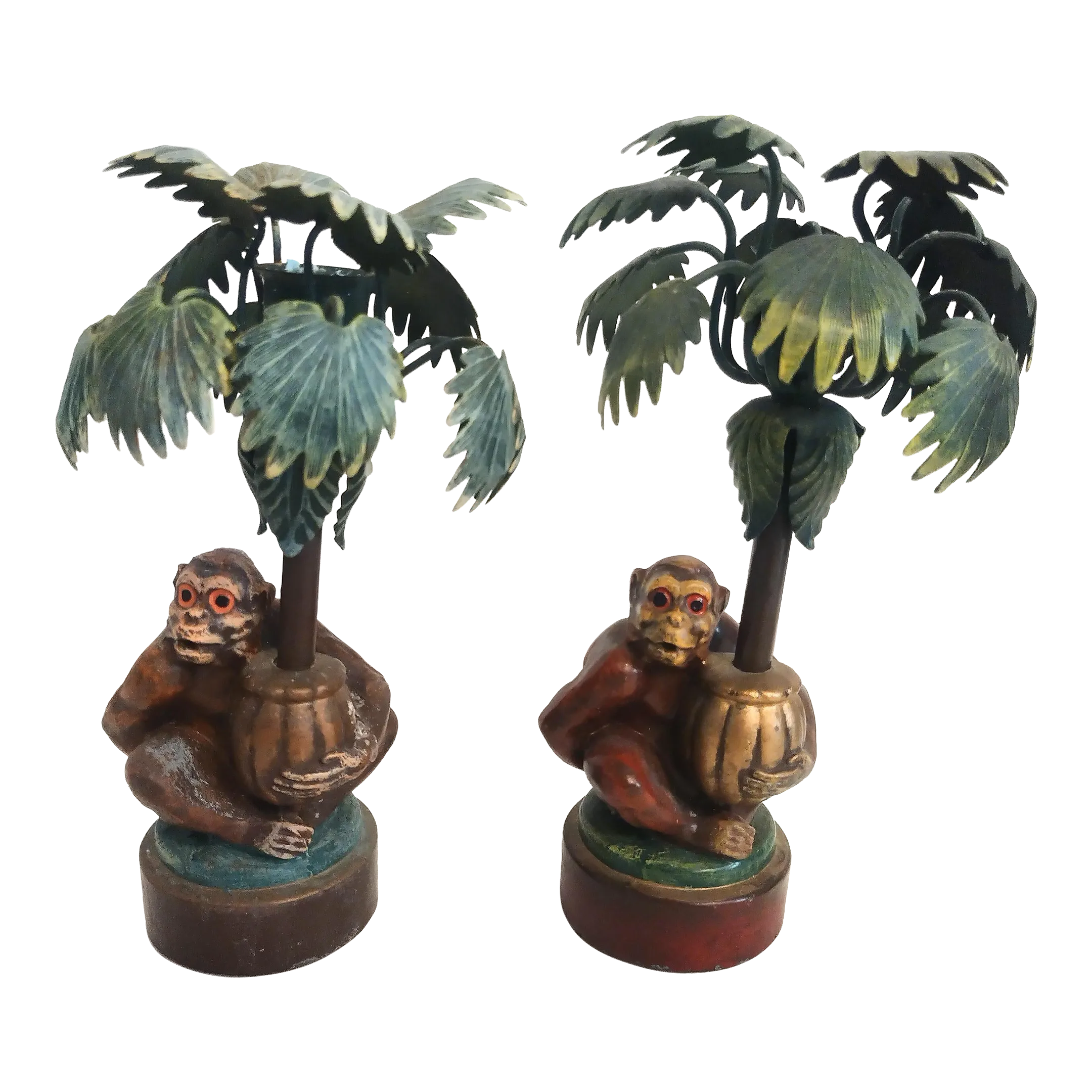 Vintage Miniature Tole Ware Monkey Palm Candle Stick Holders a Very well made.