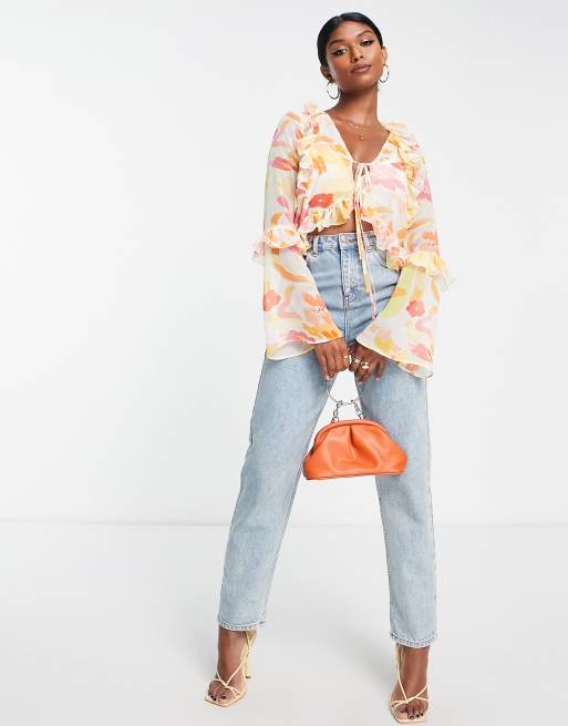 ASOS DESIGN tie front frill neck sheer blouse in print ASOS Very well made.
