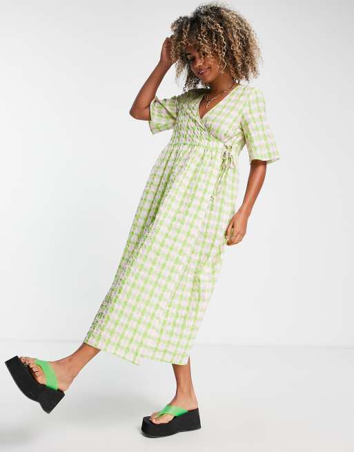 ASOS DESIGN smock tie waist wrap midi dress in green and pink check Very well made.