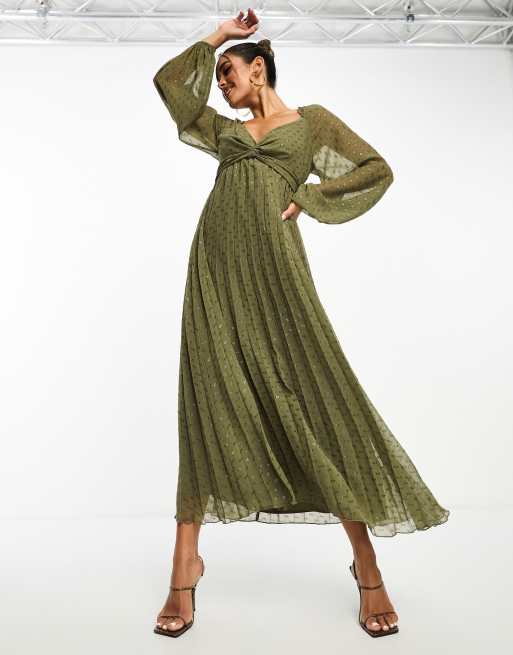 ASOS DESIGN twist front long sleeve metallic textured chiffon midi dress in olive green Very well made.