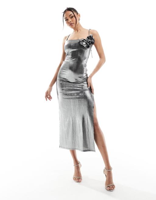 ASOS DESIGN strappy corsage detail midi dress in silver ASOS Very well made.