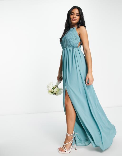 TFNC Bridesmaid chiffon maxi dress with pleated front and open back detail in sea blue Very well made.