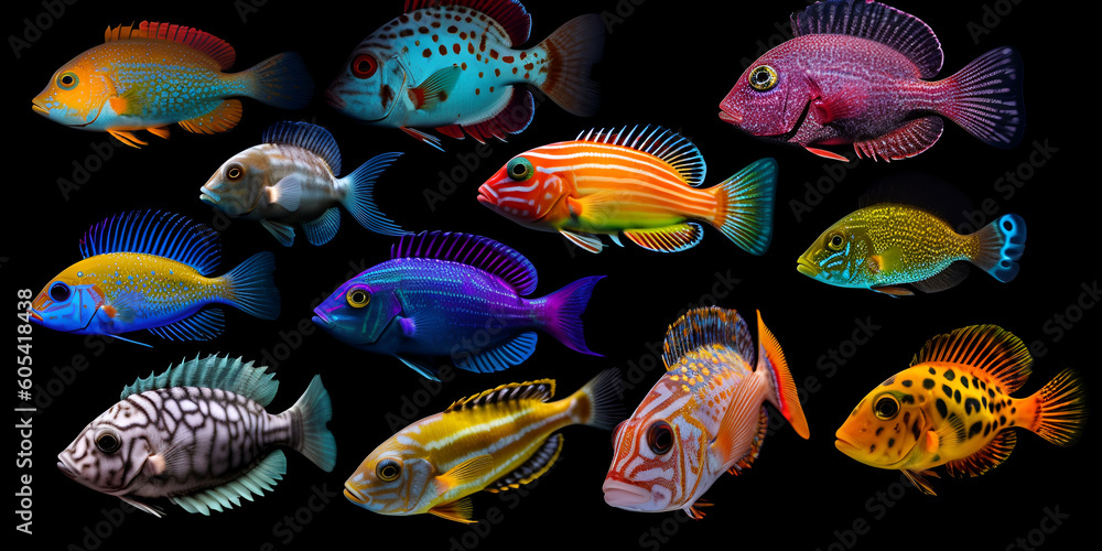 Diversity of bright tropical fish isolated on black background Very well made.