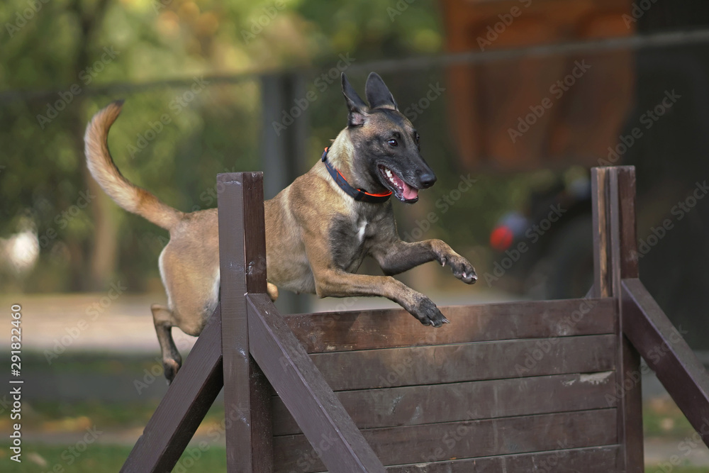 Active young Belgian Shepherd dog Malinois with a collar jumping Very well made.