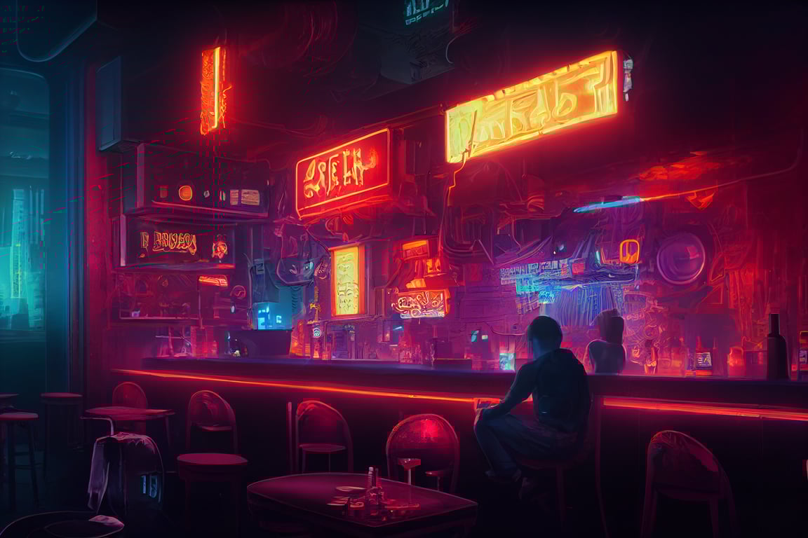 prompthunt bar cyberpunk theme bladerunner hyperealistic Very well made.