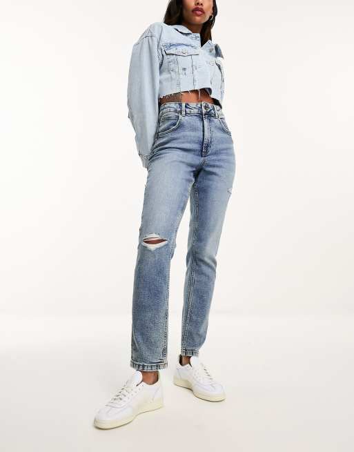 ASOS DESIGN slim mom jeans in mid blue with rip Very well made.