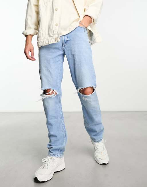 ASOS DESIGN straight leg jeans with rips in light blue wash Very well made.