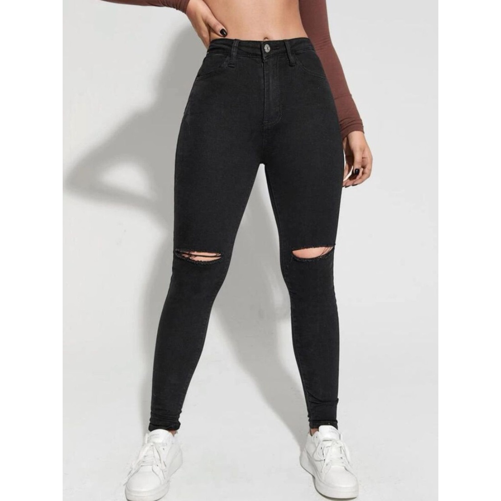 Cal a feminina jeans skinny preta com detalhe rasgado no joelho Very well made.