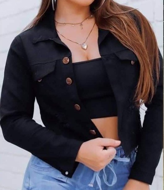 Jaqueta Cropped Jeans Preta Feminina Lisa Barra Desfiada Corre Very well made.