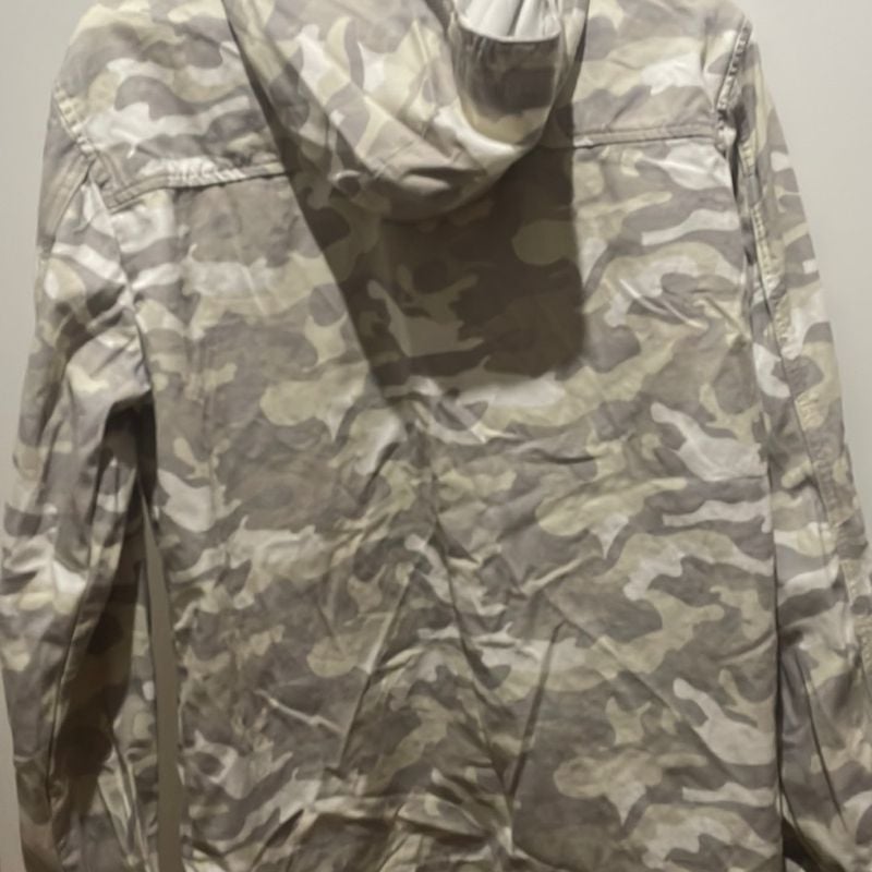 Jaqueta Cropped Quebra Vento com Capuz e Estampa Camulfada Cinza Very well made.