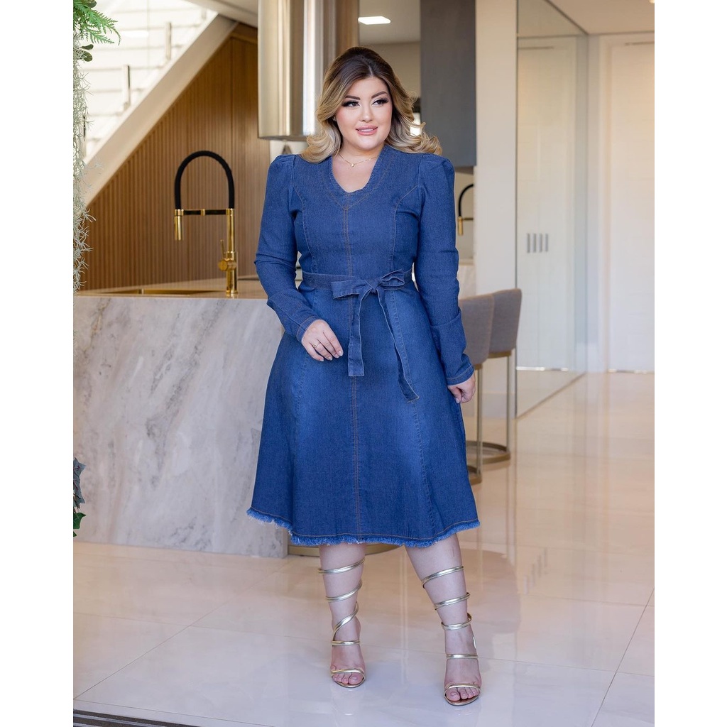 Vestido Inverno Midi Jeans Social Gola V Com Manga Longa Very well made.