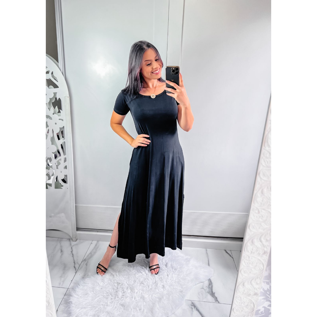 Vestido Longo Malha Gola Canoa Manga Curta Preto Very well made.