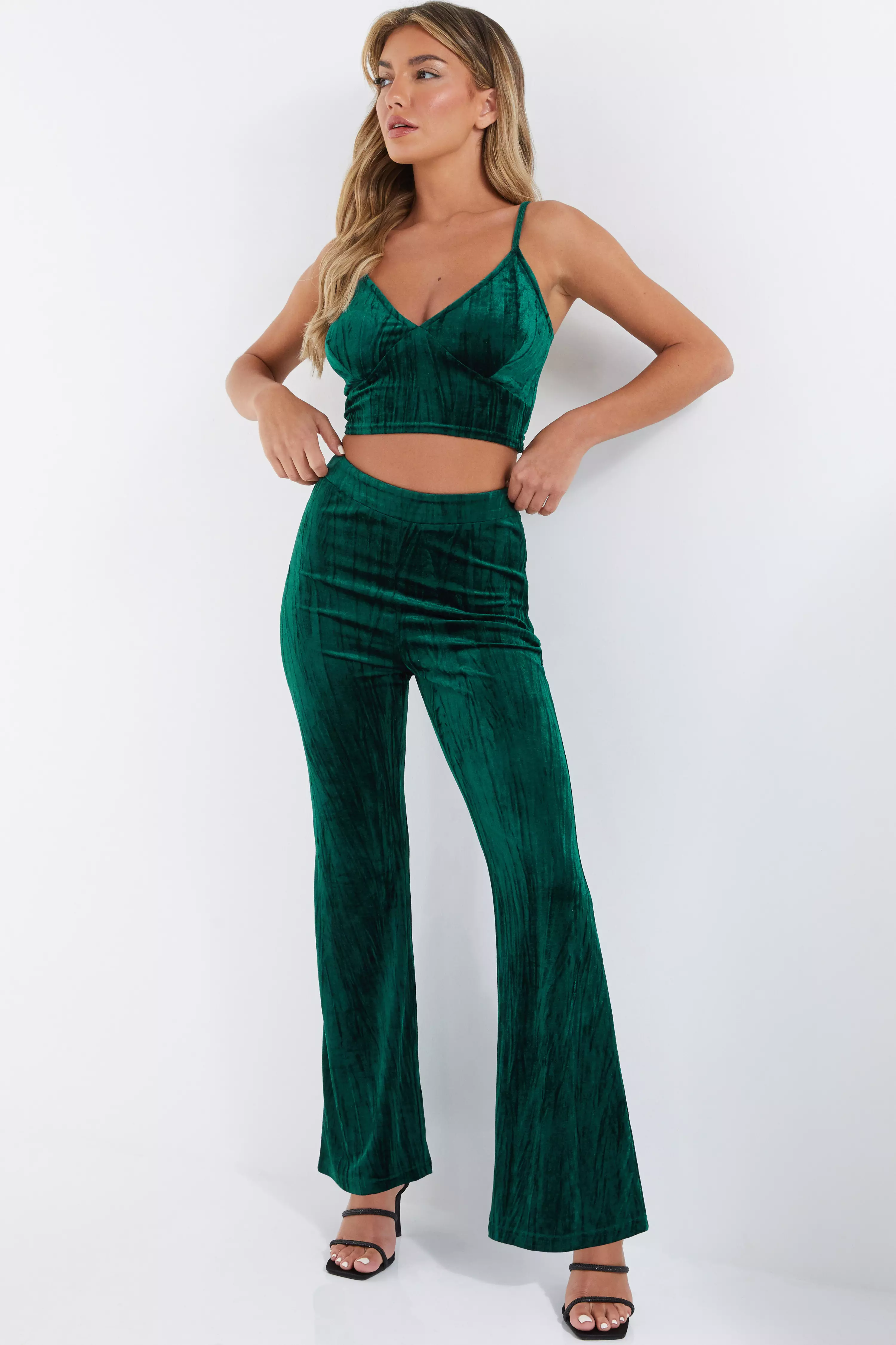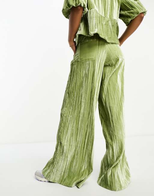 Neon Rose crushed velvet wide leg co ord trousers in green Very well made.