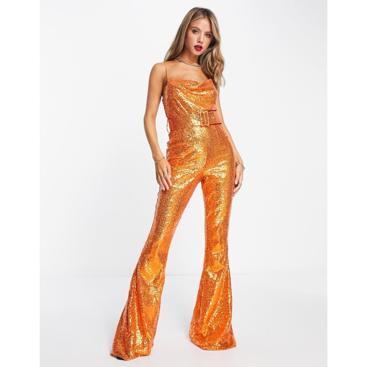 ASOS DESIGN sequin triangle halterneck jumpsuit in orange Very well made.