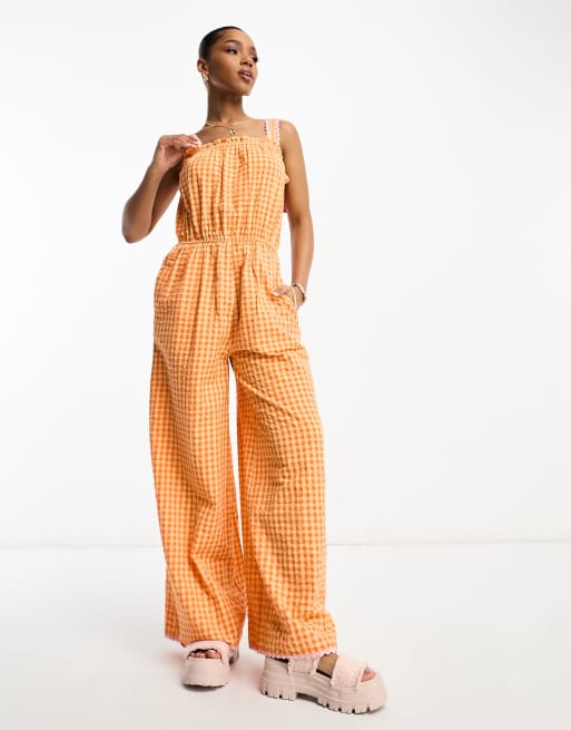 Neon Rose gingham bow detail romper jumpsuit in orange Very well made.